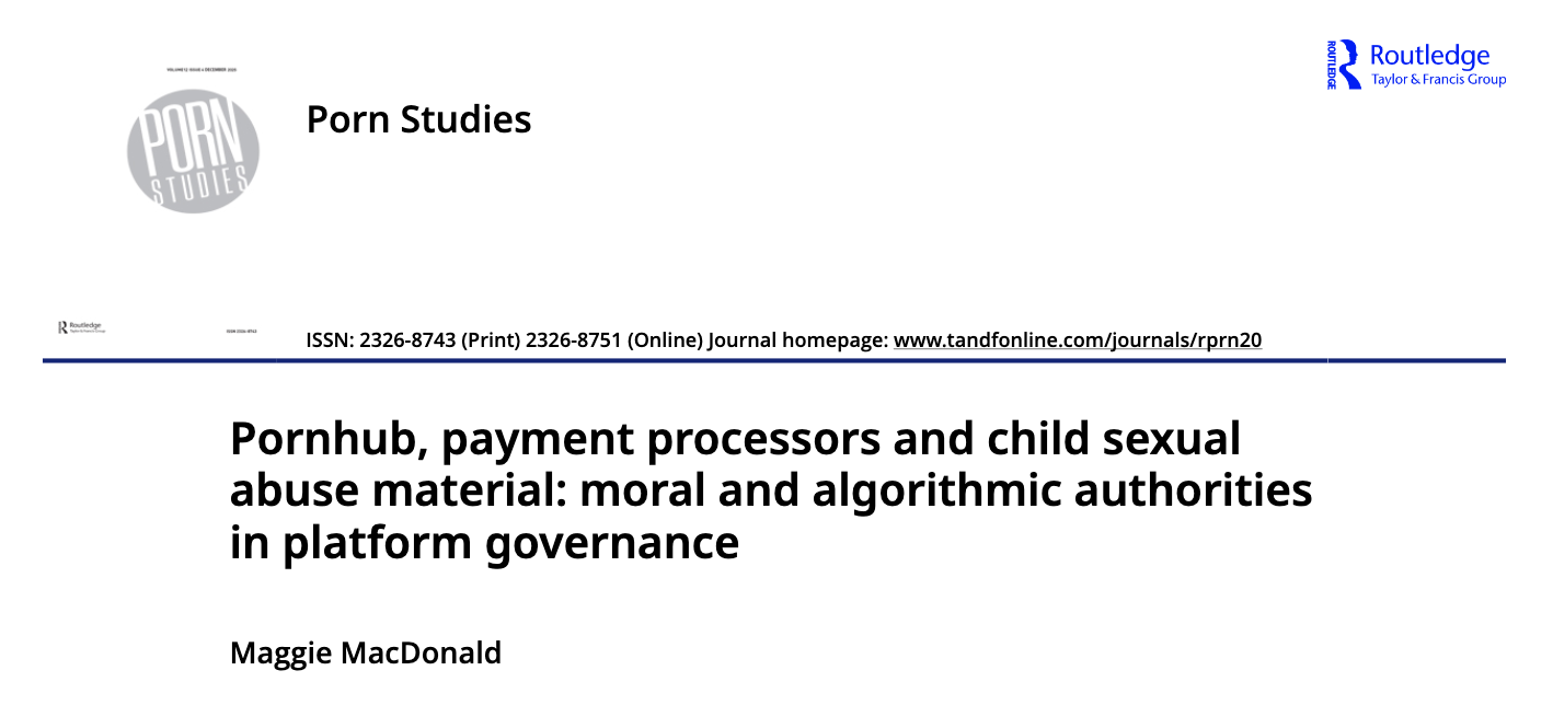 You can find my latest work in Porn Studies, The Globe and Mail, AoIR’s Selected Papers of Internet Research, The Canadian Journal of Communication, New Media & Society, First Monday and The Walrus. I currently sit on the independent Advisory Board to Pornhub.